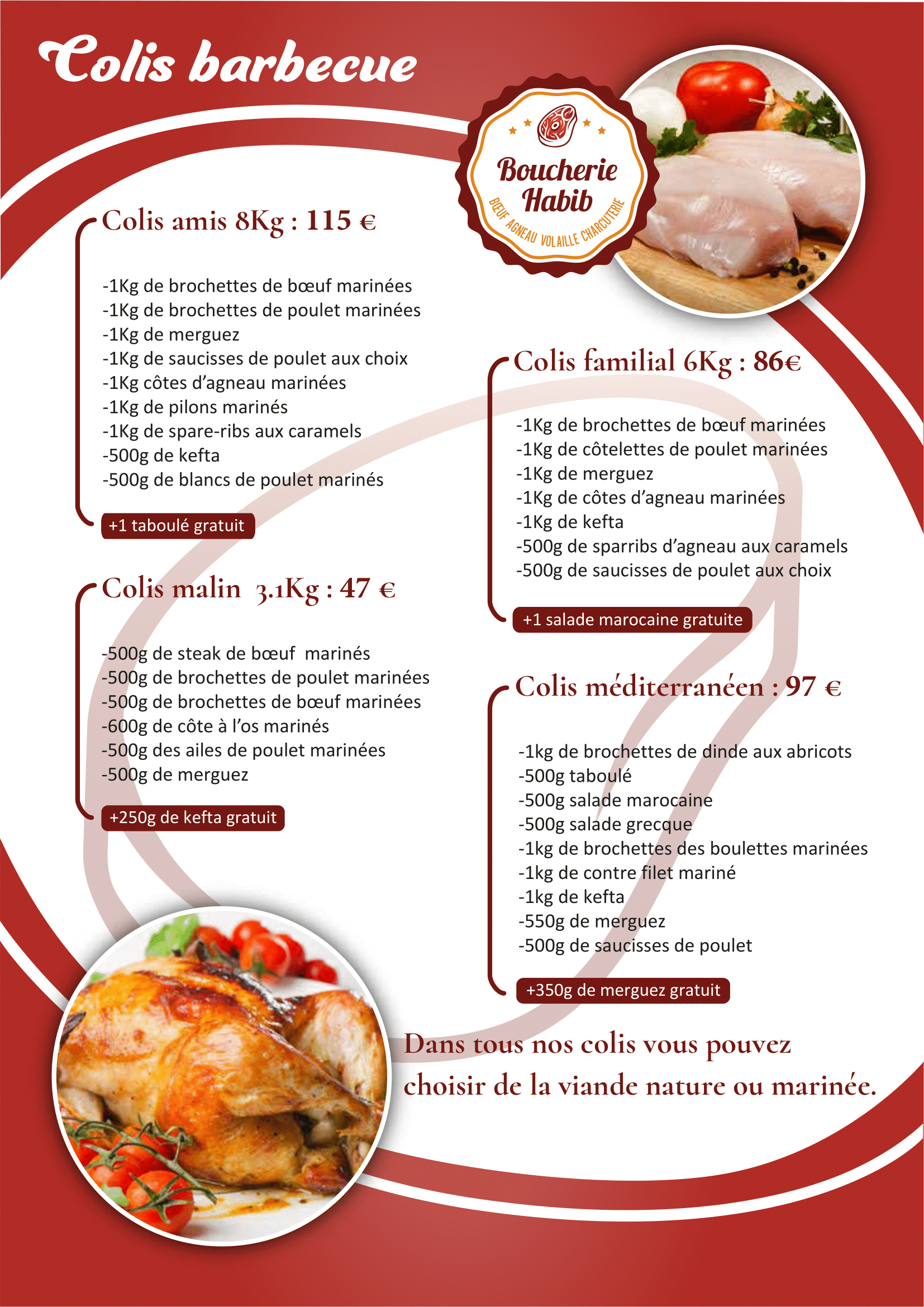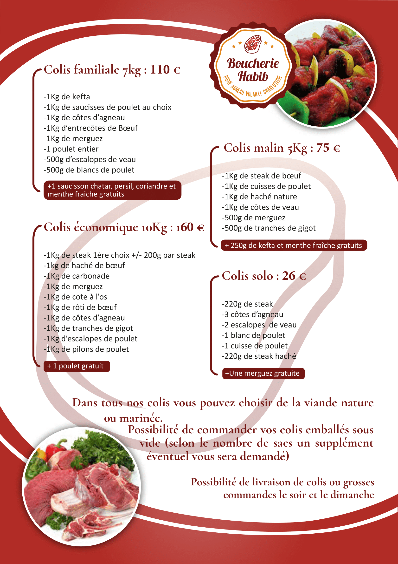 À la Boucherie Habib, nous vous proposons une sélection variée de viandes fraîches, savoureuses et issues de producteurs engagés. Que ce soit pour un repas en famille, un barbecue entre amis ou une occasion spéciale, nos viandes sont préparées avec soin pour garantir goût et tendreté.